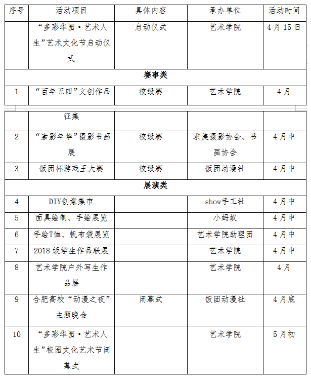 二、活動時間 2019年4月 活動承辦:藝術(shù)學(xué)院團(tuán)總支 活動協(xié)辦:藝術(shù)學(xué)院學(xué)生會、藝術(shù)學(xué)院助理團(tuán)、手工社、小螞蟻協(xié)會、書畫協(xié)會、攝影協(xié)會、論智桌游社、排球社、動漫飯團(tuán)社。 (一)4月18日中午12:00(如遇天氣原因?qū)⒄{(diào)整日期)于翰林廣場啟動“活動主題·藝術(shù)人生”校園文化藝術(shù)節(jié)啟動儀式。二級學(xué)院由行政副院長領(lǐng)隊(duì),組織團(tuán)總支書記,各級各類學(xué)生組織骨干代表、學(xué)生代表5人參與啟動儀式;校級學(xué)生組織由校團(tuán)委統(tǒng)一組織。各單位提前20分鐘到達(dá)廣場,按照指定位置列隊(duì),著裝要求以簡單大方為主,佩戴團(tuán)徽。 (二)各學(xué)院、各組織鼓勵并動員學(xué)生參與“多彩華園·藝術(shù)人生”文化節(jié)系列活動,通過文化藝術(shù)節(jié)系列活動培養(yǎng)學(xué)生藝術(shù)審美,豐富學(xué)生的藝術(shù)生活。活動具體安排如下: (一) 關(guān)注微信公眾號“安徽新華學(xué)院團(tuán)委”,點(diǎn)擊菜單欄“PU口袋校園”注冊并登陸,首頁找到活動,點(diǎn)擊“報(bào)名”,參與活動。 (一)校園文化月活動作為高校校園文化內(nèi)涵的一種外在表現(xiàn)形式,是展示學(xué)院師生良好精神風(fēng)貌的重要窗口,對于進(jìn)一步激發(fā)廣大師生工作學(xué)習(xí)的積極性和主動性,對于創(chuàng)造和諧、求知、進(jìn)步的育人環(huán)境,具有十分重要的意義。 (二)藝術(shù)學(xué)院團(tuán)總支、學(xué)生會要發(fā)揮骨干作用,強(qiáng)化措施,組織得力,注重實(shí)效。在開展活動時要注意調(diào)動學(xué)生的積極性、創(chuàng)造性,增強(qiáng)活動的實(shí)效性,擴(kuò)大學(xué)生的參與面,爭取使每位同學(xué)都參加一項(xiàng)活動,把本次文化月辦成學(xué)生參與面廣、活動多、質(zhì)量高的一屆盛會,讓學(xué)生真正在活動中施其所長,發(fā)展個性,使青年學(xué)生在活動中得到教育和熏陶,不斷擴(kuò)大校園主流文化的影響力。 (三)各項(xiàng)活動要圍繞“多彩華園·藝術(shù)人生”的主題,抓住有利契機(jī),圍繞學(xué)生成長、成才精心設(shè)計(jì),認(rèn)真組織落實(shí),力求精品。所有參展作品應(yīng)適合當(dāng)代大學(xué)生的基本特征,體現(xiàn)當(dāng)代青春風(fēng)采。參賽所需用品自備。 (四)各二級學(xué)院積極鼓勵并動員學(xué)生參與“多彩華園·藝術(shù)人生”文化節(jié)系列活動,立足文明校園建設(shè),引導(dǎo)學(xué)生向上生活,躍動青春。各社團(tuán)結(jié)合主題開展活動,活動結(jié)束將于閉幕式進(jìn)行相關(guān)獲獎表彰。