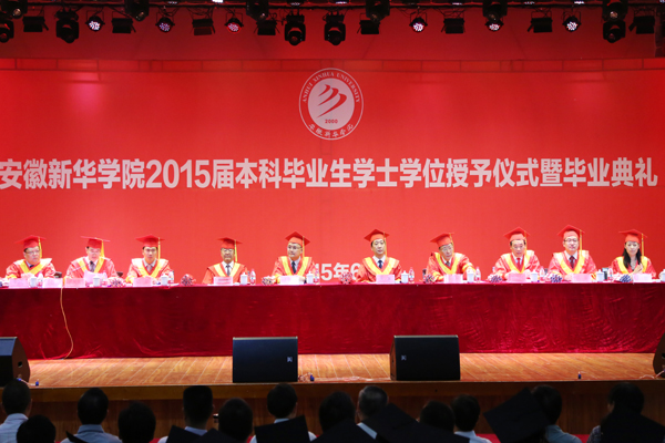 儀式由副校長馬鳳余教授主持。校長助理王麗宣讀了《關于表彰2015年安徽新華學院品學兼優畢業生的決定》文件。副校長楊世國教授宣讀了《學位評定委員會2015年上半年關于授予陳孔燕、陳碧等學士學位的決定》文件。