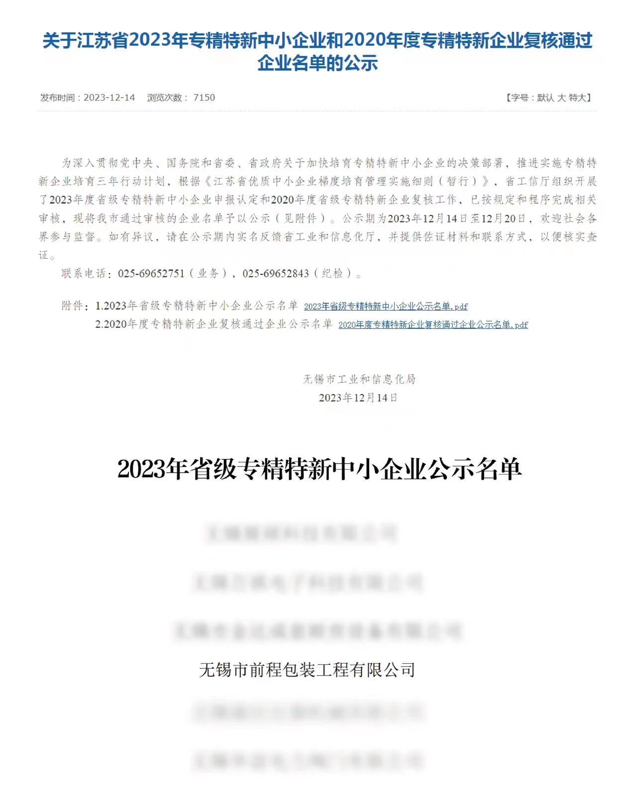 近日,無錫市工業和信息化局發布了《關于江蘇省2023年專精特新中小企業和2020年度專精特新企業復核通過企業名單的公示》,前程公司從眾多申報的企業中脫穎而出,被認定為江蘇省“專精特新”企業。